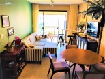 Apartamento em condomínio de frente para o mar, com sala de estar e jantar integradas com tv, wi-fi e ar-condicionado, sacada com churrasqueira, 1 suíte e 1 dormitório com ar-condicionado, 1 banheiro social, cozinha e área de serviço. Localizado no condomínio América do sol de frente pro mar na Praia Brava. O imóvel aconchega 05 pessoas, ideal para famílias que buscam conforto e entretenimento na praia e descansar na beira da Piscina.
